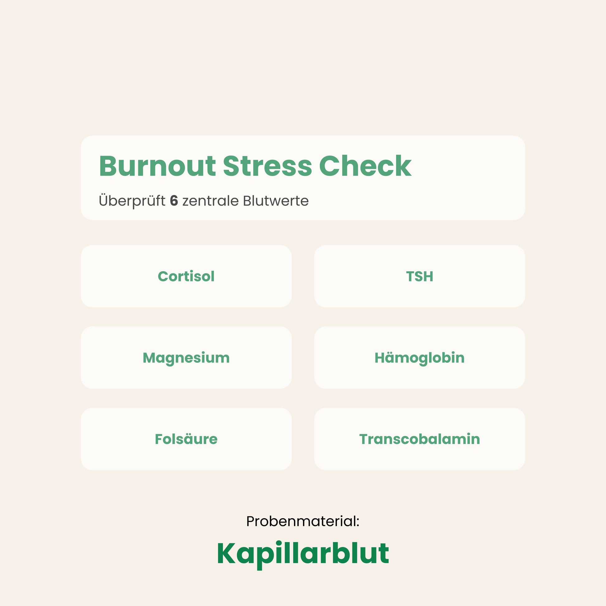 Le stress chronique peut fortement affecter le corps et l’esprit. Avec le test de stress Burnout, tu obtiens des informations précieuses sur les hormones du stress, la thyroïde et des nutriments essentiels qui influencent ton niveau d’énergie. Facilement depuis chez toi – avec une analyse professionnelle en laboratoire et un résultat numérique.