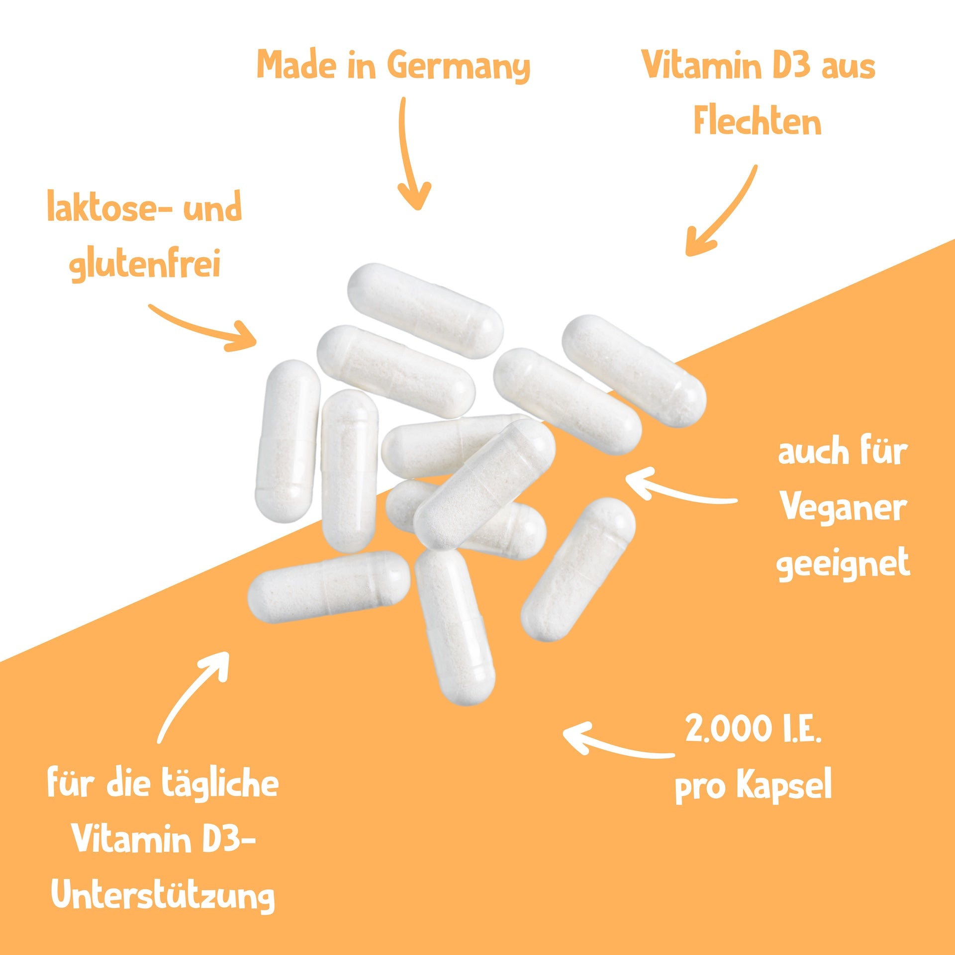 Un apport suffisant en vitamine D3 est essentiel pour ta santé et ton bien-être. Notre Vitamin D3 biomo® 2 000 UI vegan soutient :