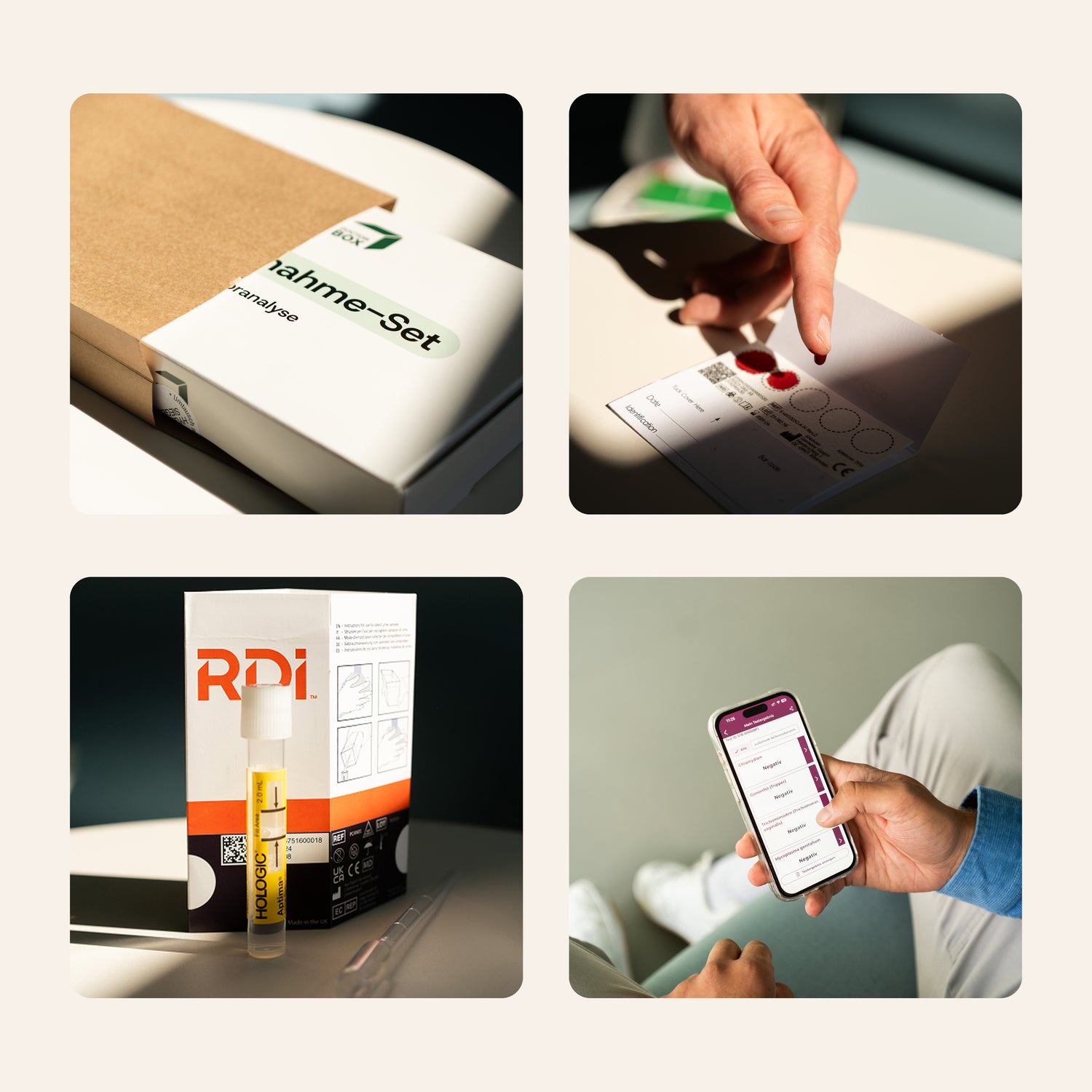 Je nach Test nimmst du entweder eine Urinprobe oder eine Trockenblutprobe mit dem mitgelieferten Set. Eine Schritt-für-Schritt-Anleitung ist immer dabei.