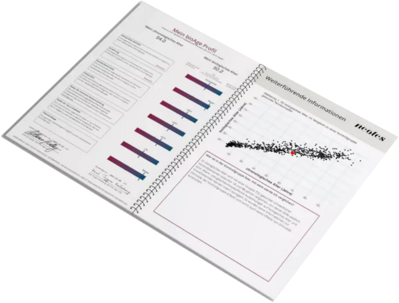 After approximately 4 weeks, you will receive a protected report containing your biological age, selected measurement parameters and personal recommendations from our longevity experts based on your epigenetic profile to improve your biological age.