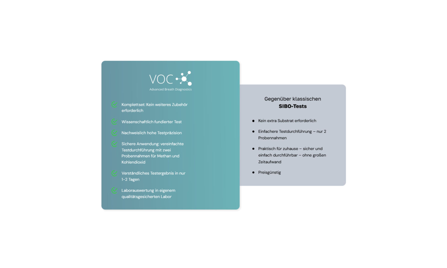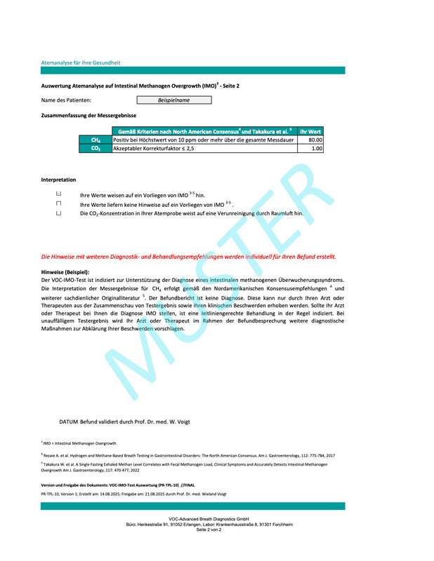 - The VOC-IMO test uses a specially developed method to measure methane and carbon dioxide in a single measurement process. This ensures particularly high precision in breath analysis.